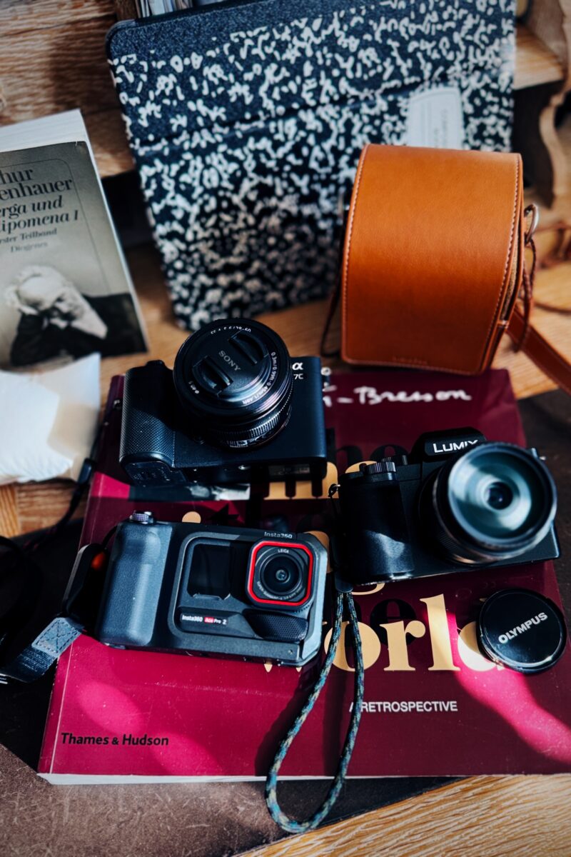 Auf dem Foto sieht man meine liebsten Kameras in der aktuellen Gegenwart. Es sind die Sony A7c, die Panasonic Lumix G110 und die Insta360 Ace Pro 2. Nur die letzte Kamera ist jünger als drei Jahre.